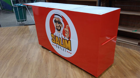 Balcão de atendimento envelopado com adesivo 0,10 de impressão digital com Tintura eco solvente e verniz 03 anos